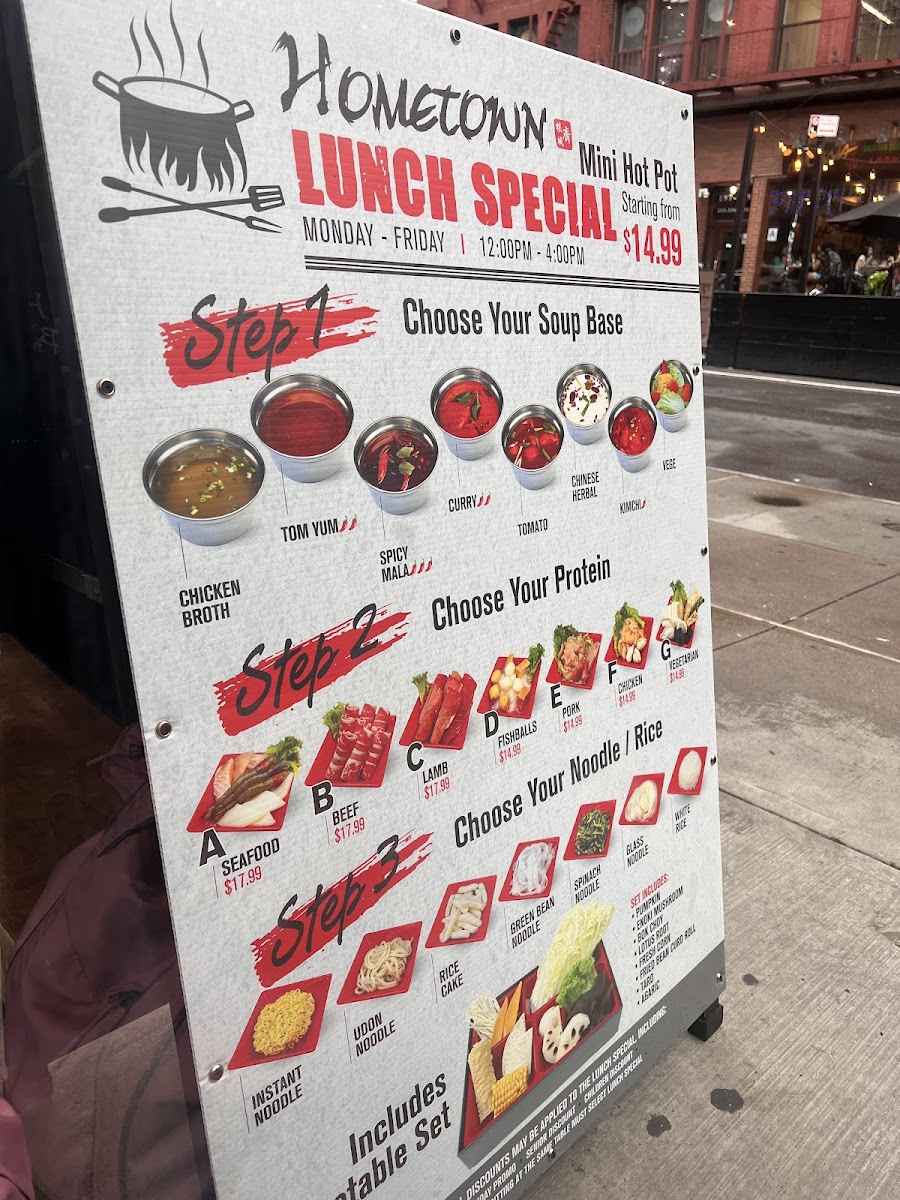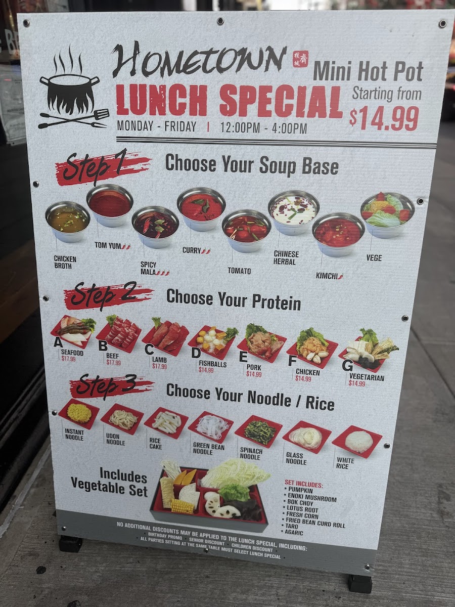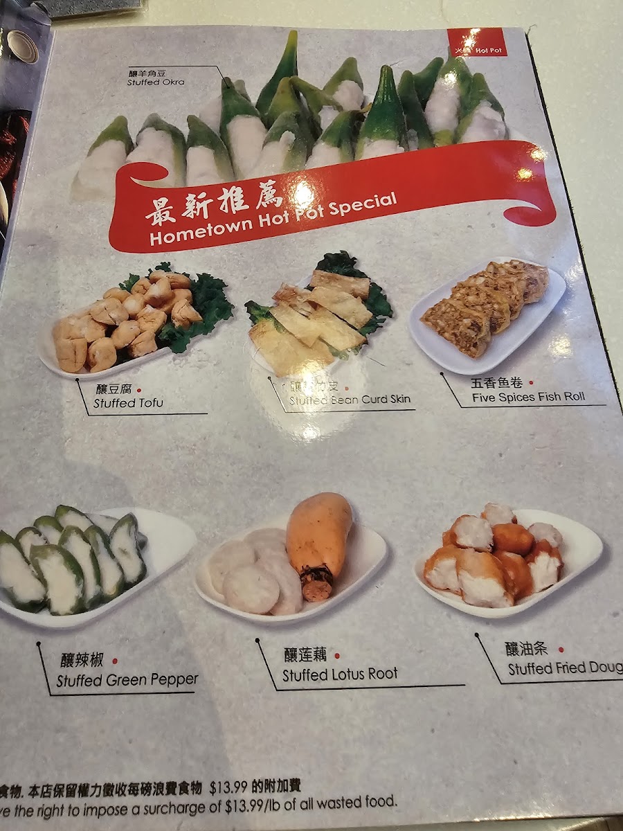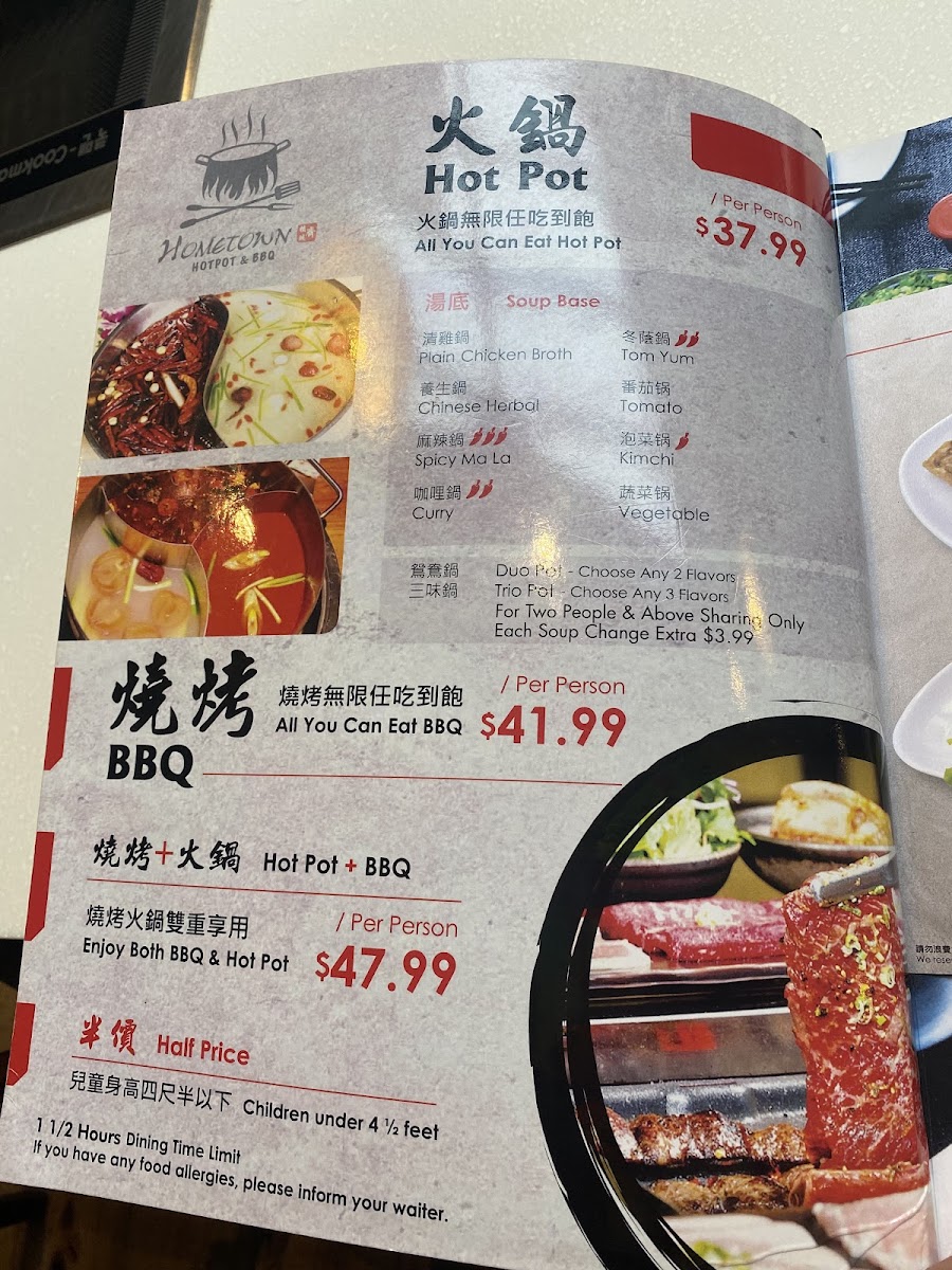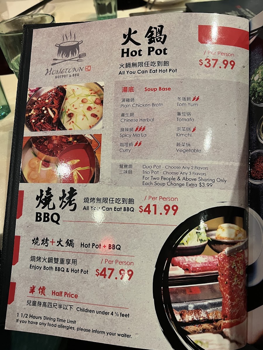 The menu at Hometown Hotpot & BBQ features a comprehensive selection designed for hot pot and Korean-style barbecue dining. It offers an all-you-can-eat format allowing guests to customize their meals with a variety of options across multiple categories.